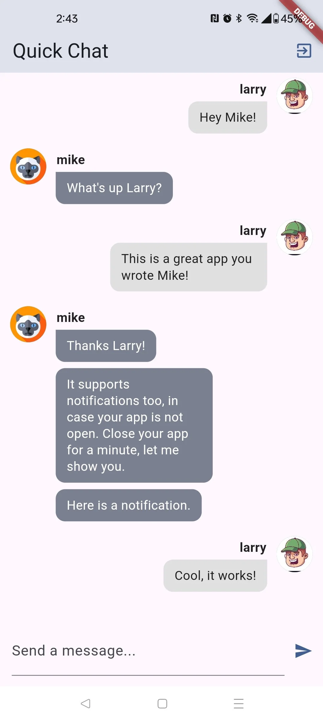Personal project to create a simple messenger app powered by Firebase. Also added Firebase authentication (Email & password). When a user registers, they will provide an email, user name & avatar image. The image and user name will be used in the chat screen to identify them. If a user is offline from the app, and a chat message is sent to them, they will receive a push notification.